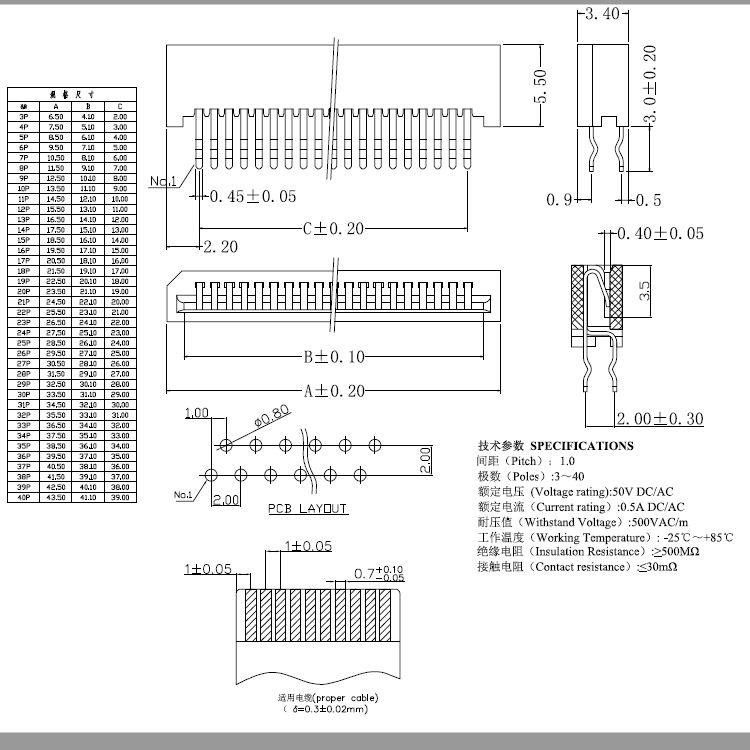 1.0pitch 雙排正腳立插單面接觸H=3.4