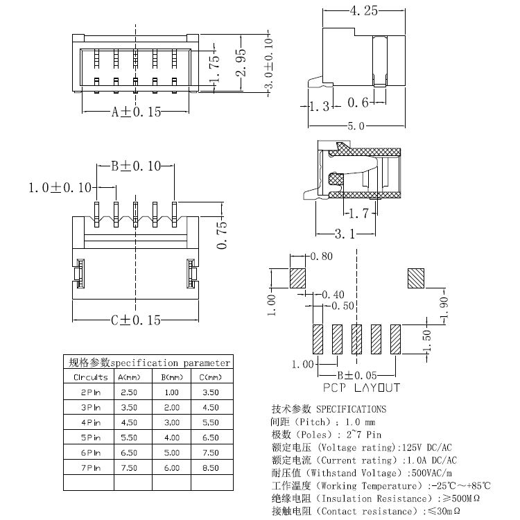 間距1.0-1×nP單排臥貼帶下扣針座