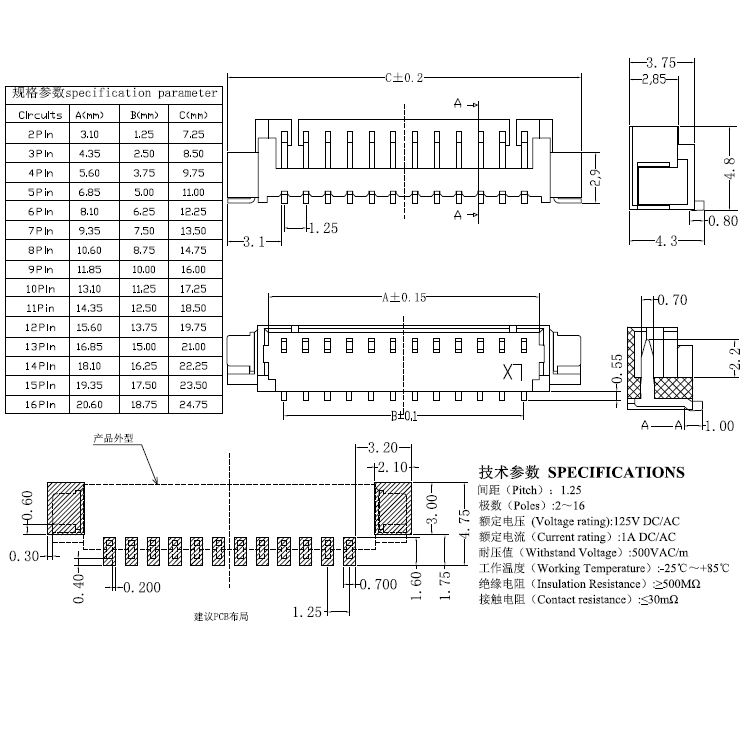間距1.25-1×nP單排有開口立貼針座不加蓋PINP125BLX-nP