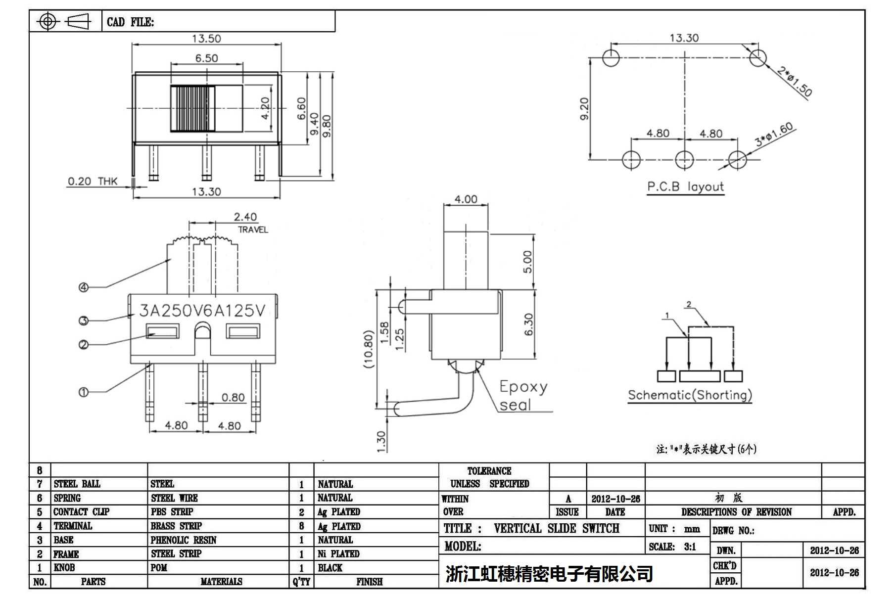 Technical parameters of high current slide switch: