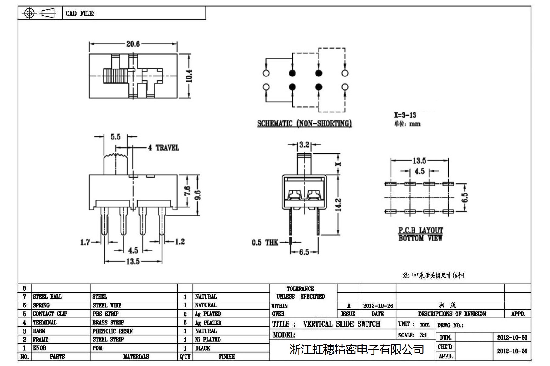Verticaltoggle switch side dial/ Vertical slide switch technical indicators
