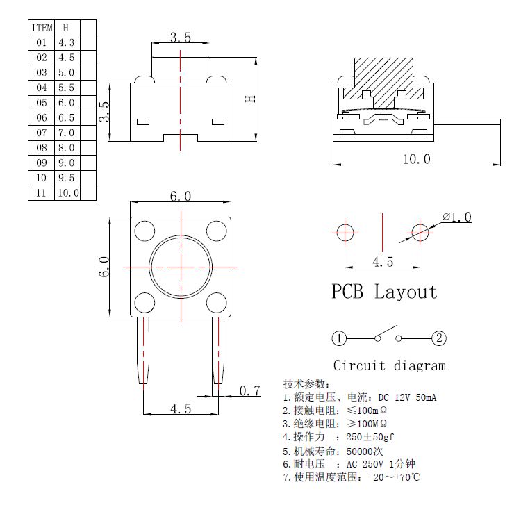 規(guī)格:6mm*6mm ? ? ? ? ? ? ? ? ?力度:250士50gf