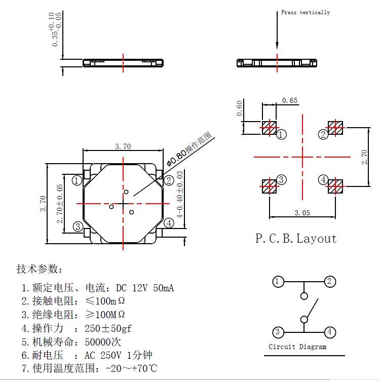 規格:3.7mm*3.7mm ? ? ? ? ? ? ? ? ?力度:250士50gf