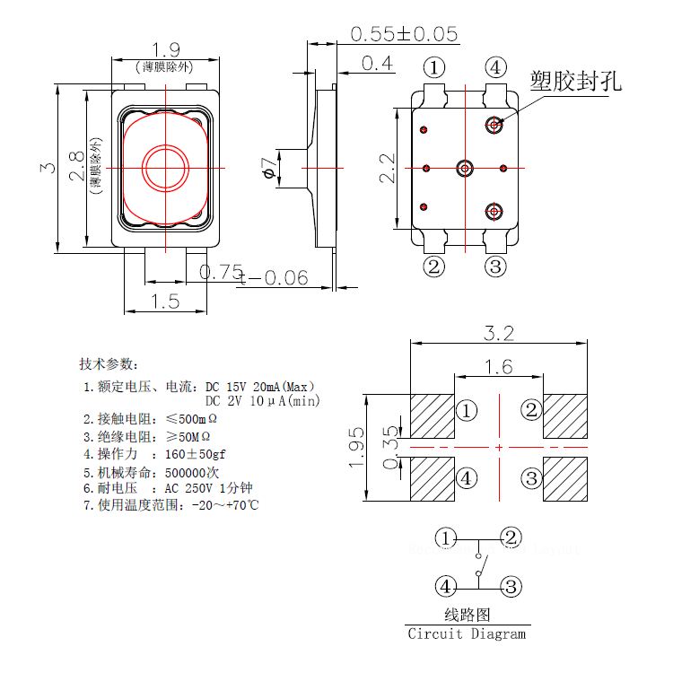 規(guī)格:2.8mm*1.9mm ? ? ? ? ? ? ? ? ?力度:160士50gf