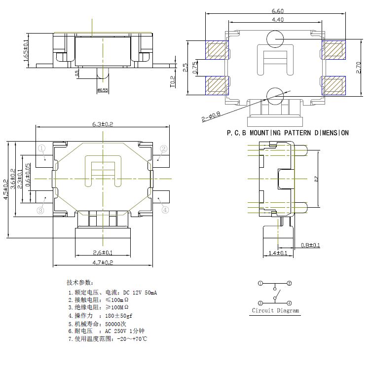 1. 額定電流、電壓: DC 12V 50mA 2. 接觸電阻: ≤100mΩMAX