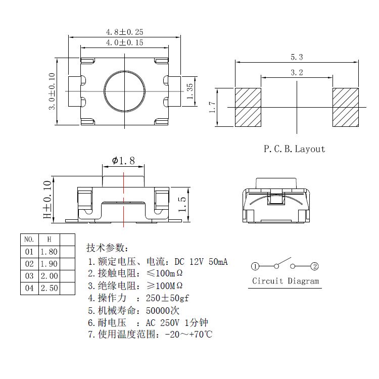 7. 使用濕度: ≤85% RH 8. 使用壽命: 50000次