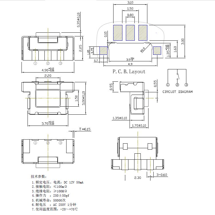 7. 使用濕度: ≤85% RH 8. 使用壽命: 50000次