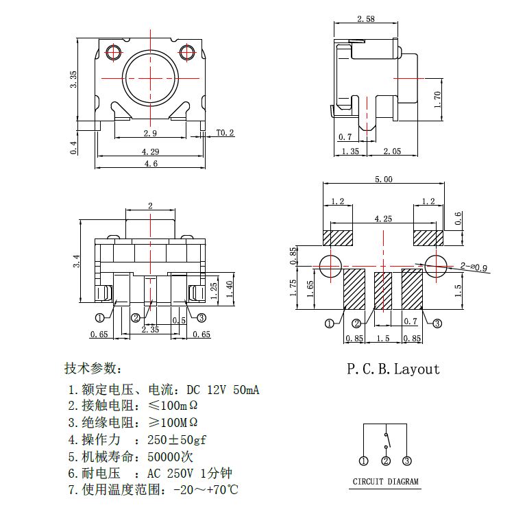 輕觸開(kāi)關(guān)技術(shù)參數(shù): 1. 額定電流、電壓: DC 12V 50mA 2. 接觸電阻: ≤100mΩMAX 3. 絕緣電阻: ≥100MΩMIN 4. 介電強(qiáng)度: ≥250VAC/1min 5. 回流焊: 250°CMAX 6. 使用溫度: -25 ℃ to 70 ℃ 7. 使用濕度: ≤85% RH 8. 使用壽命: 50000次 應(yīng)用:數(shù)碼、安防、電腦、通訊產(chǎn)品、家用電器、智能家居、穿戴產(chǎn)品等。 |