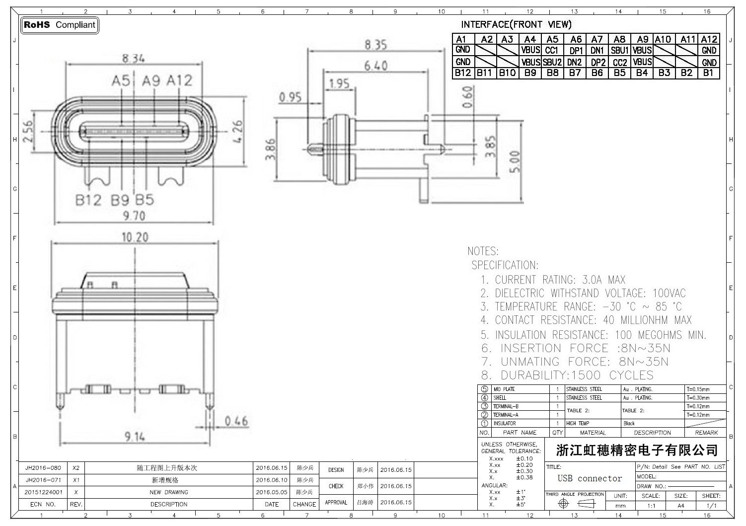 USB TypeC防水母座技術參數: