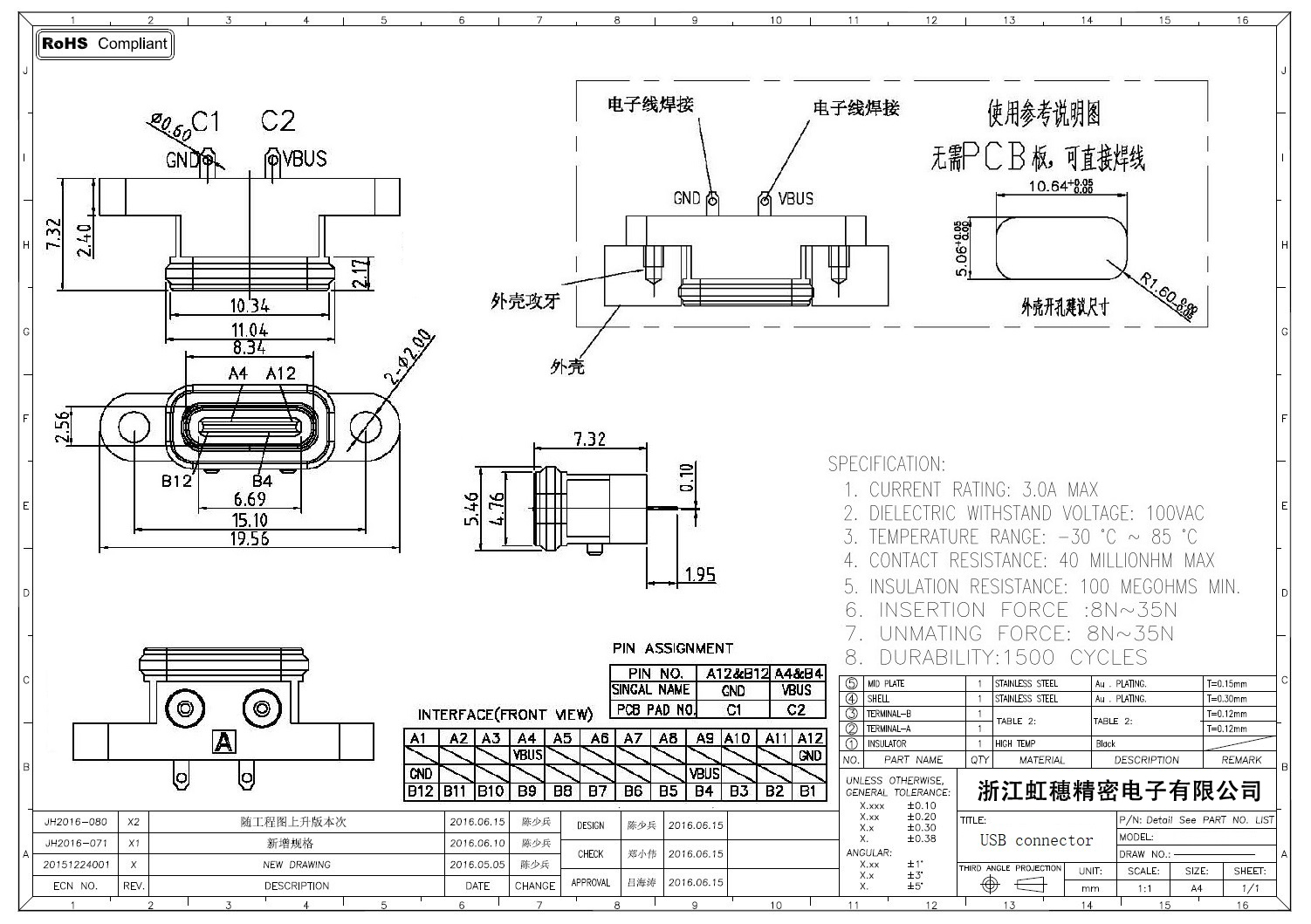 USB TypeC防水母座技術(shù)參數(shù):