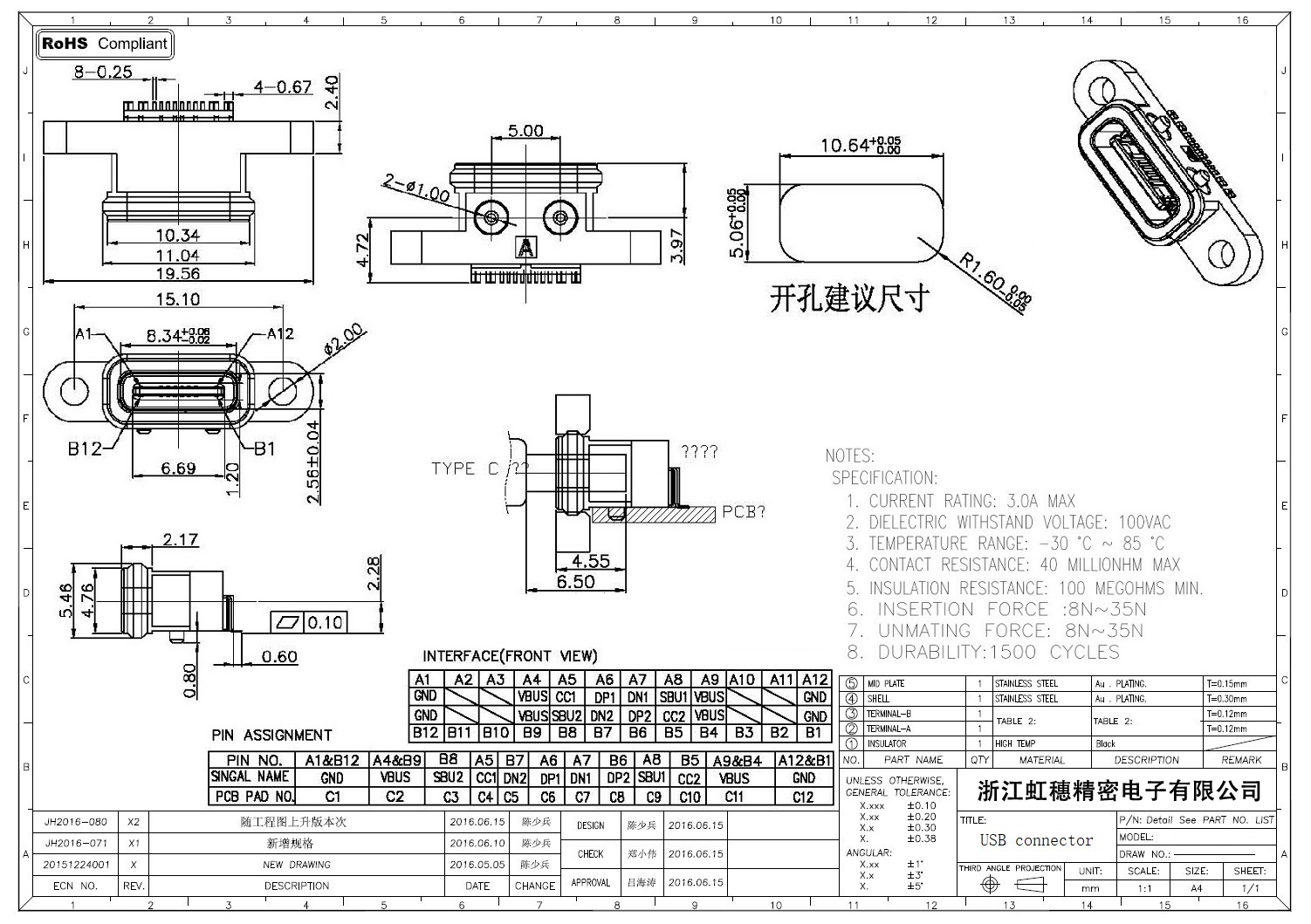 USB TypeC防水母座技術參數:
