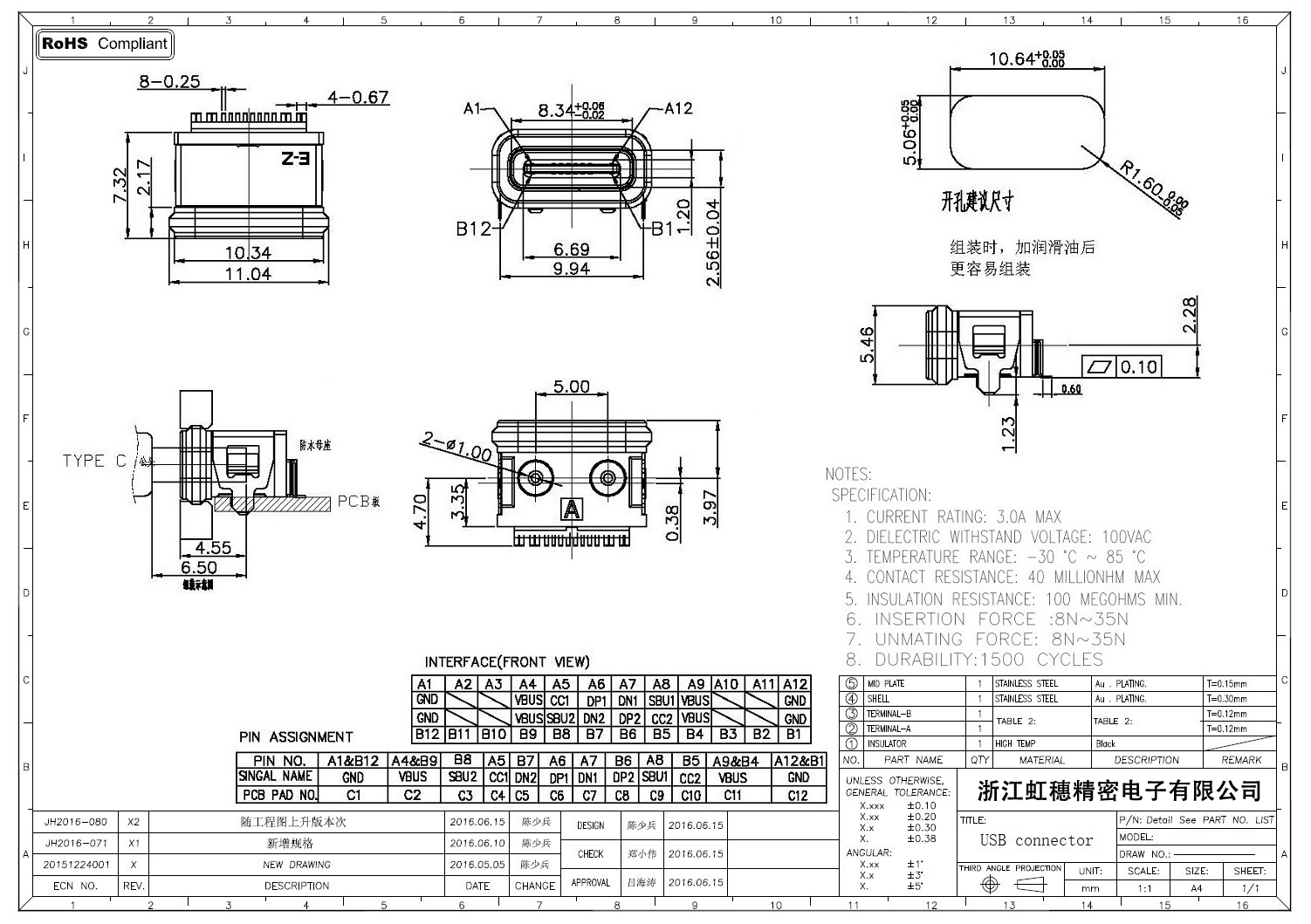 USB TypeC防水母座技術參數: