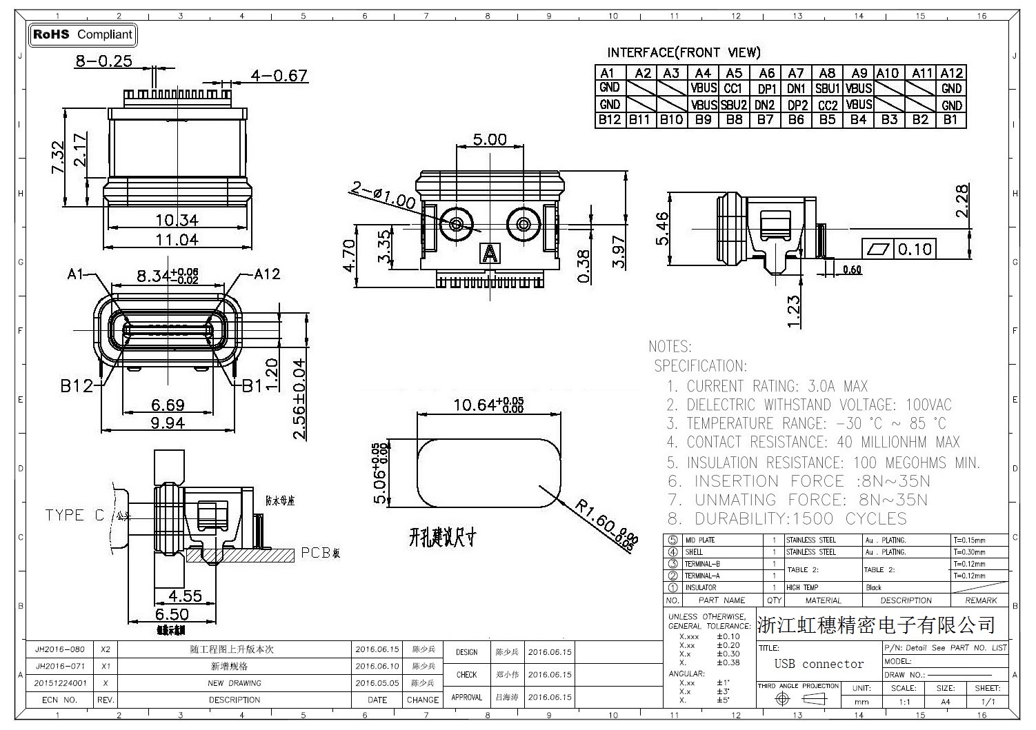 USB TypeC防水母座技術參數: