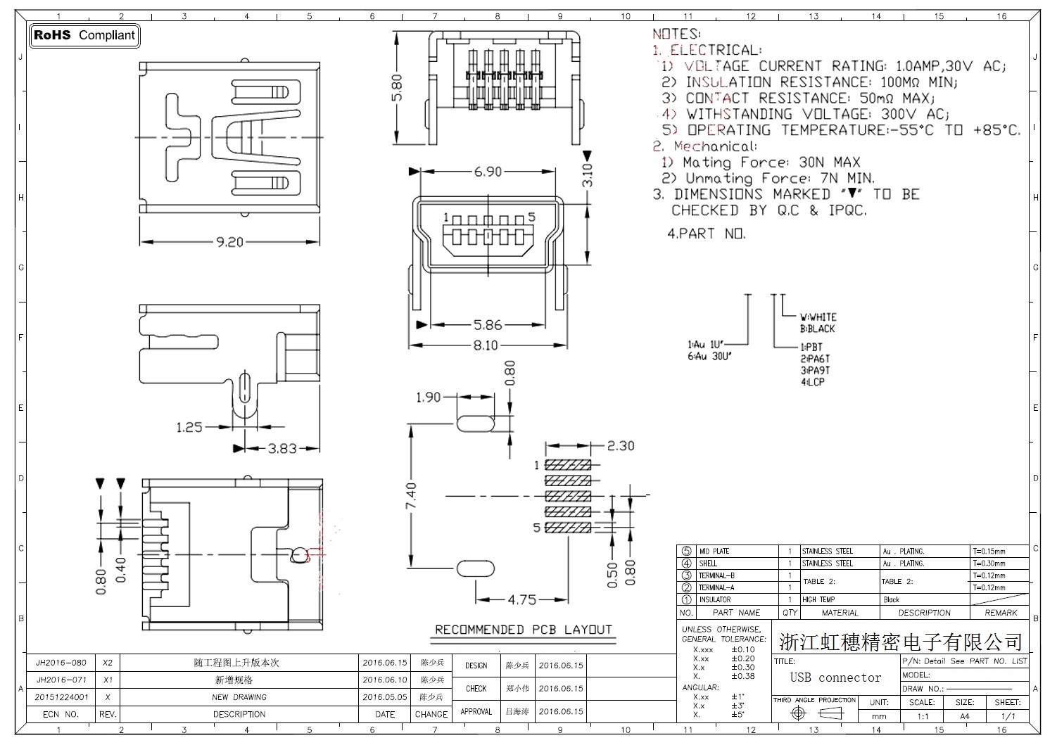 MINI USB插座技術參數: