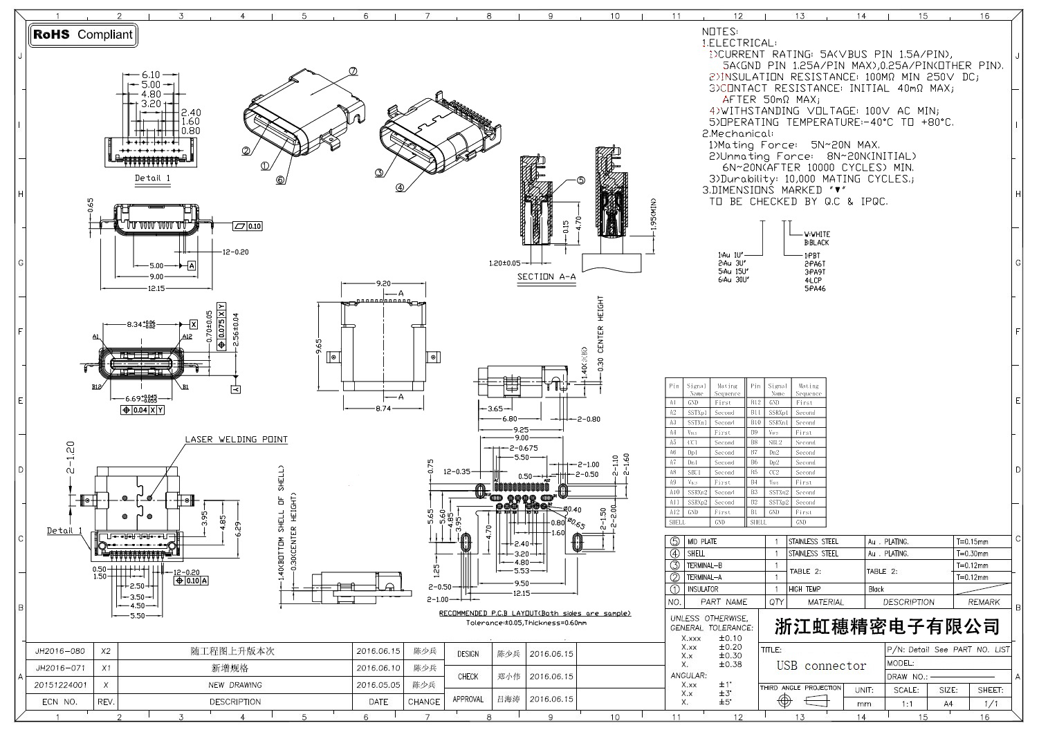 USB Type C母座技術參數: