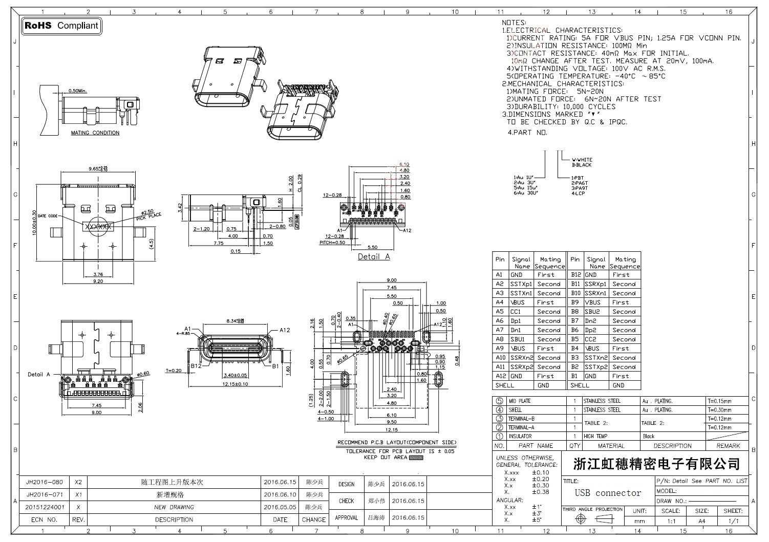 USB Type C母座技術參數: