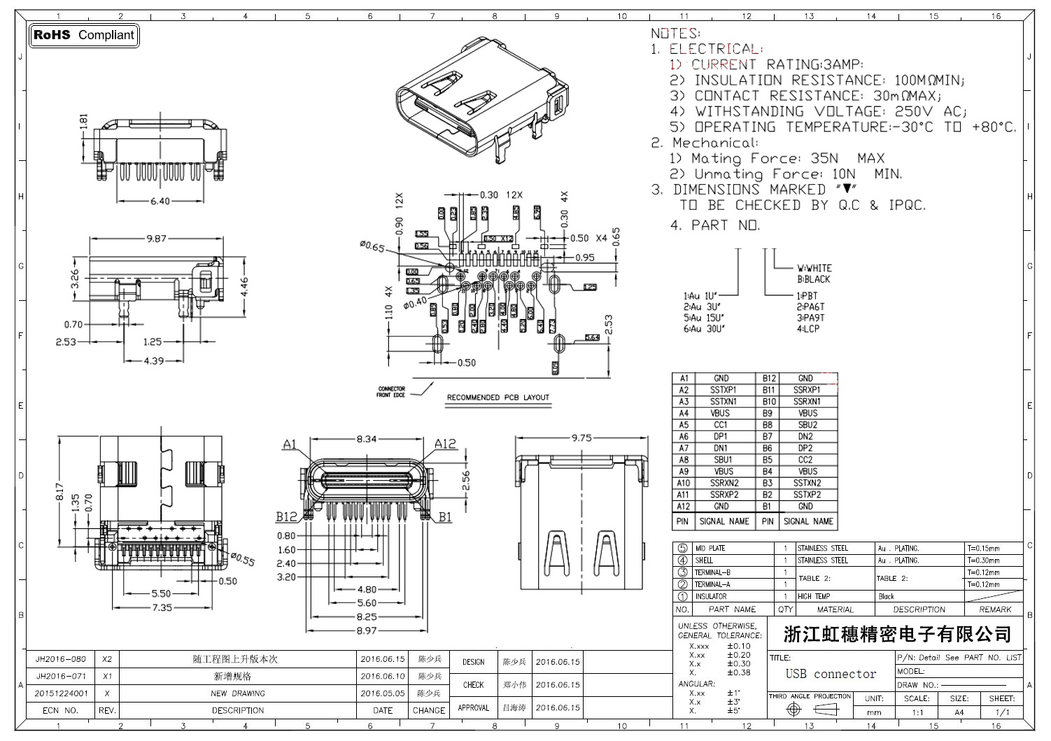 USB Type C母座技術(shù)參數(shù):