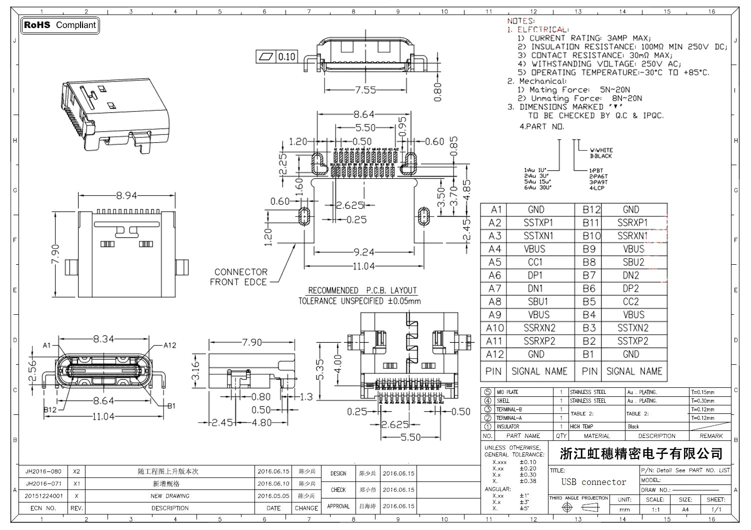 USB Type C母座技術(shù)參數(shù):