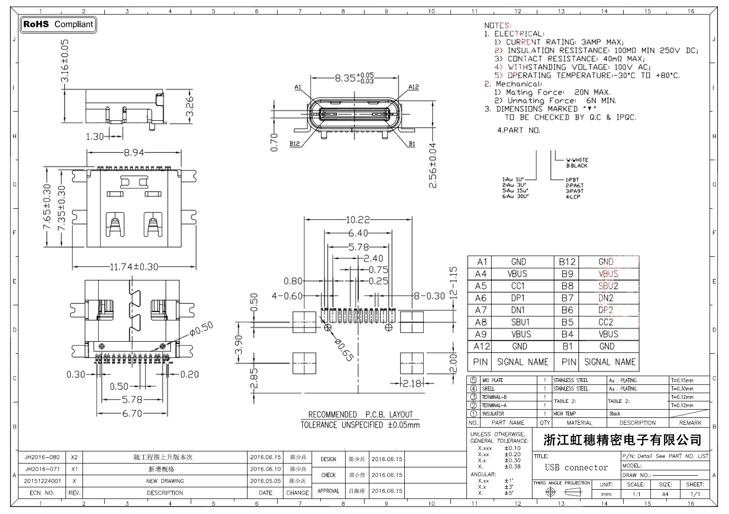 USB Type C母座技術參數:
