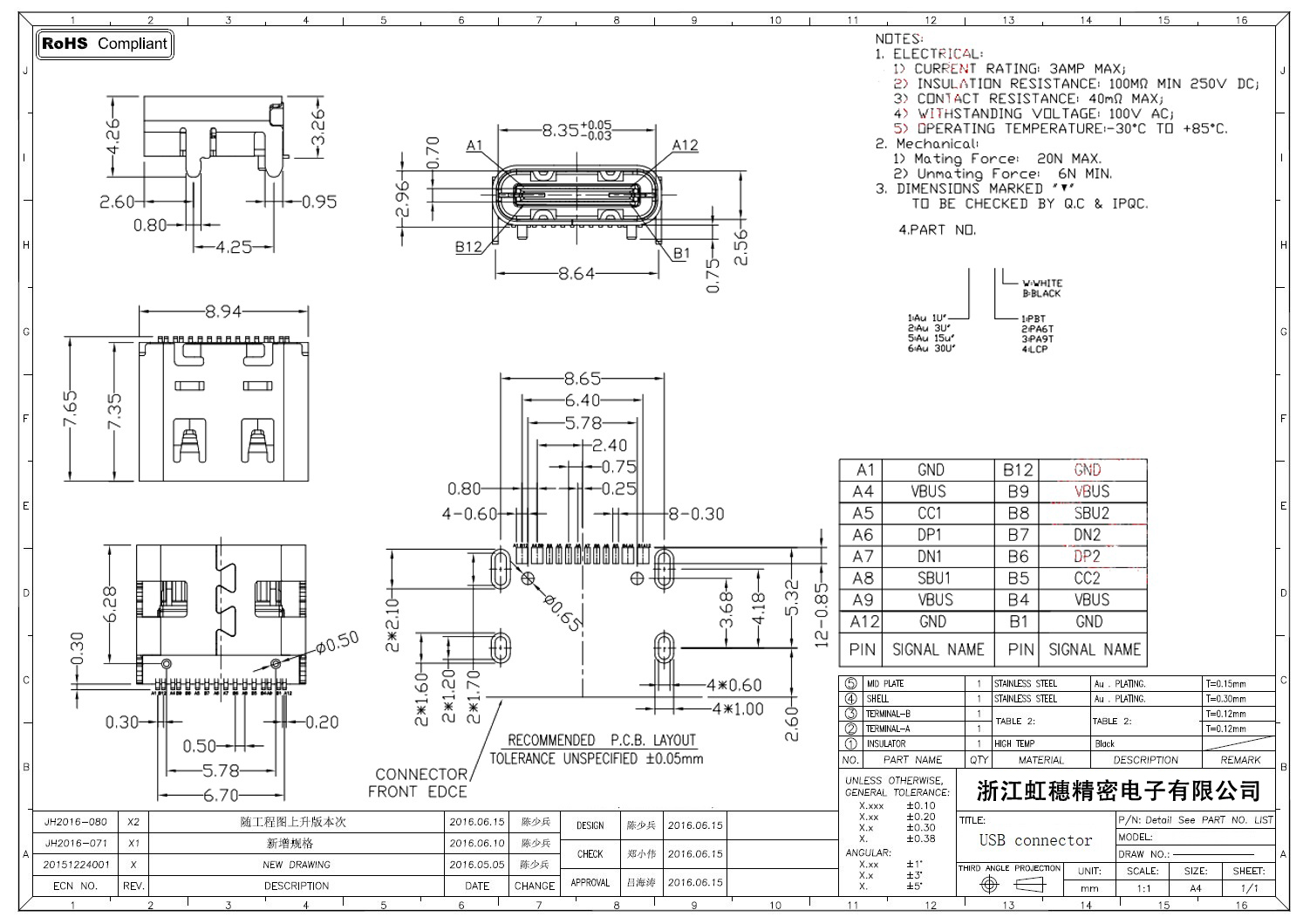 USB Type C母座技術參數: