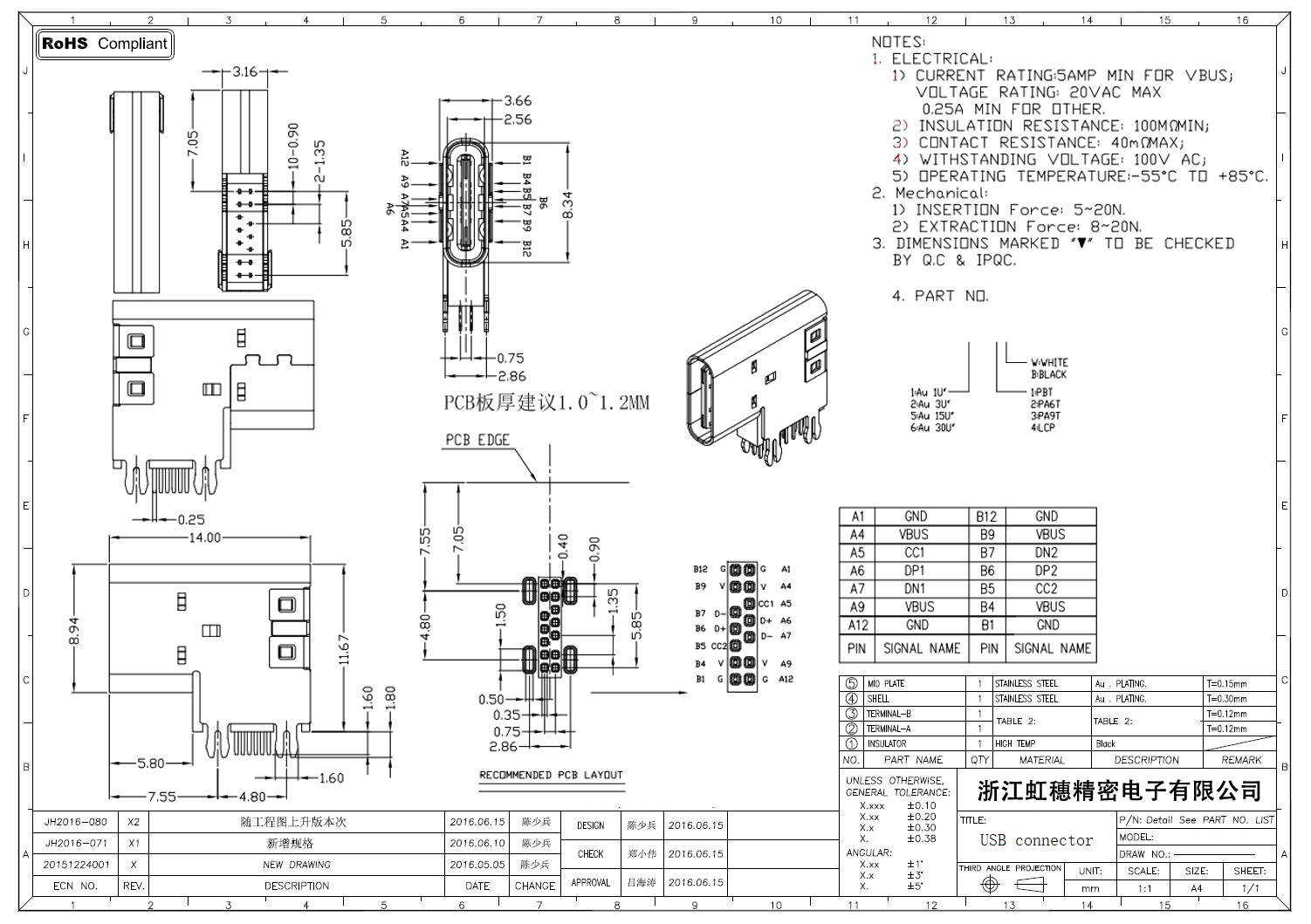USB Type C母座技術參數: