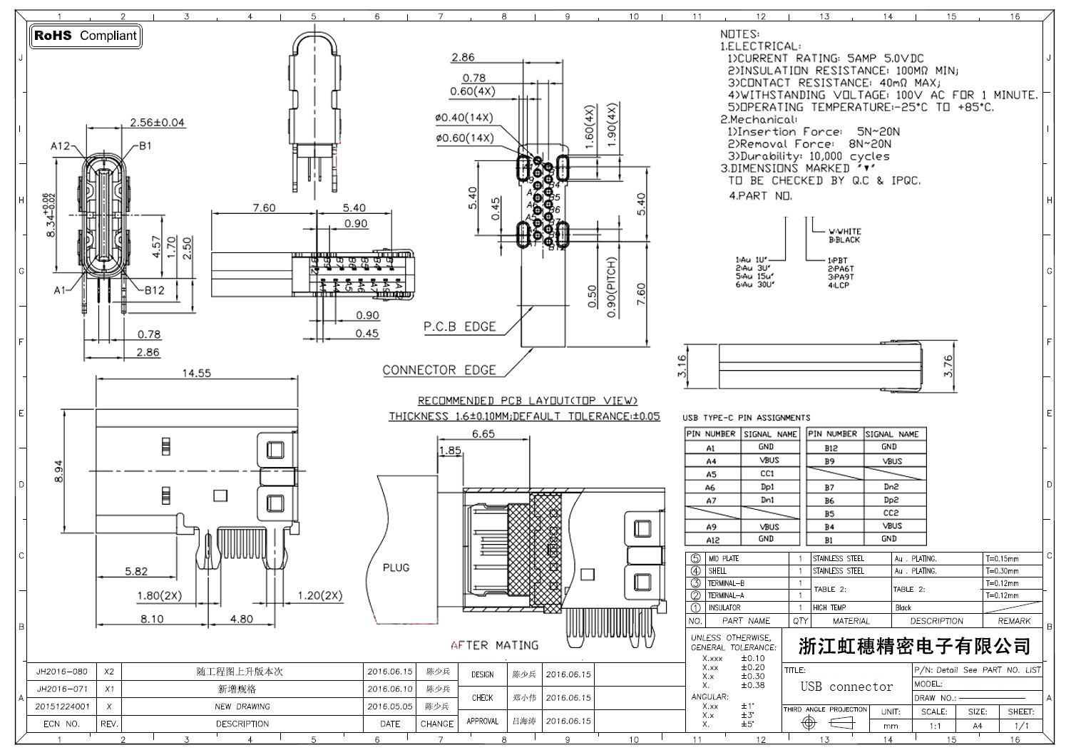 USB Type C母座技術參數: