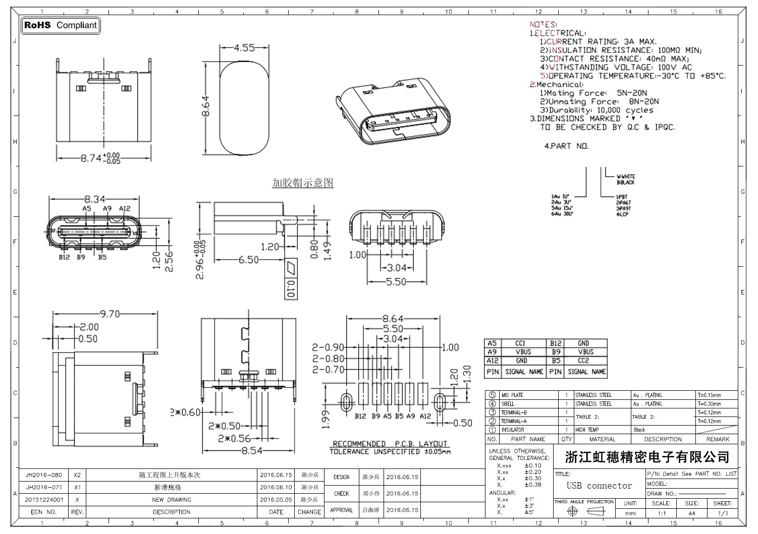USB Type C母座技術(shù)參數(shù):