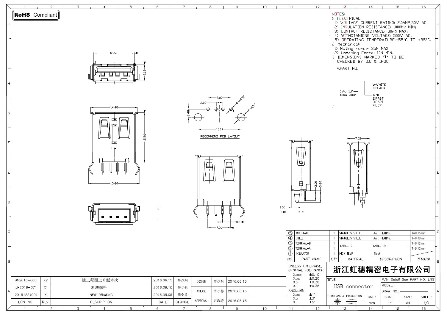 2.0USB插座技術參數: