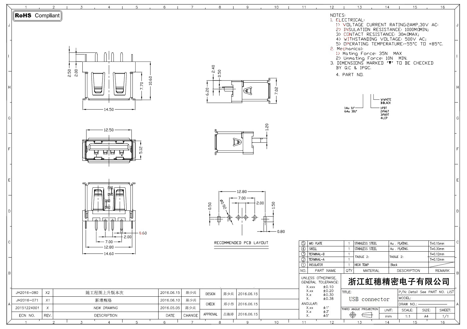 2.0USB插座技術參數: