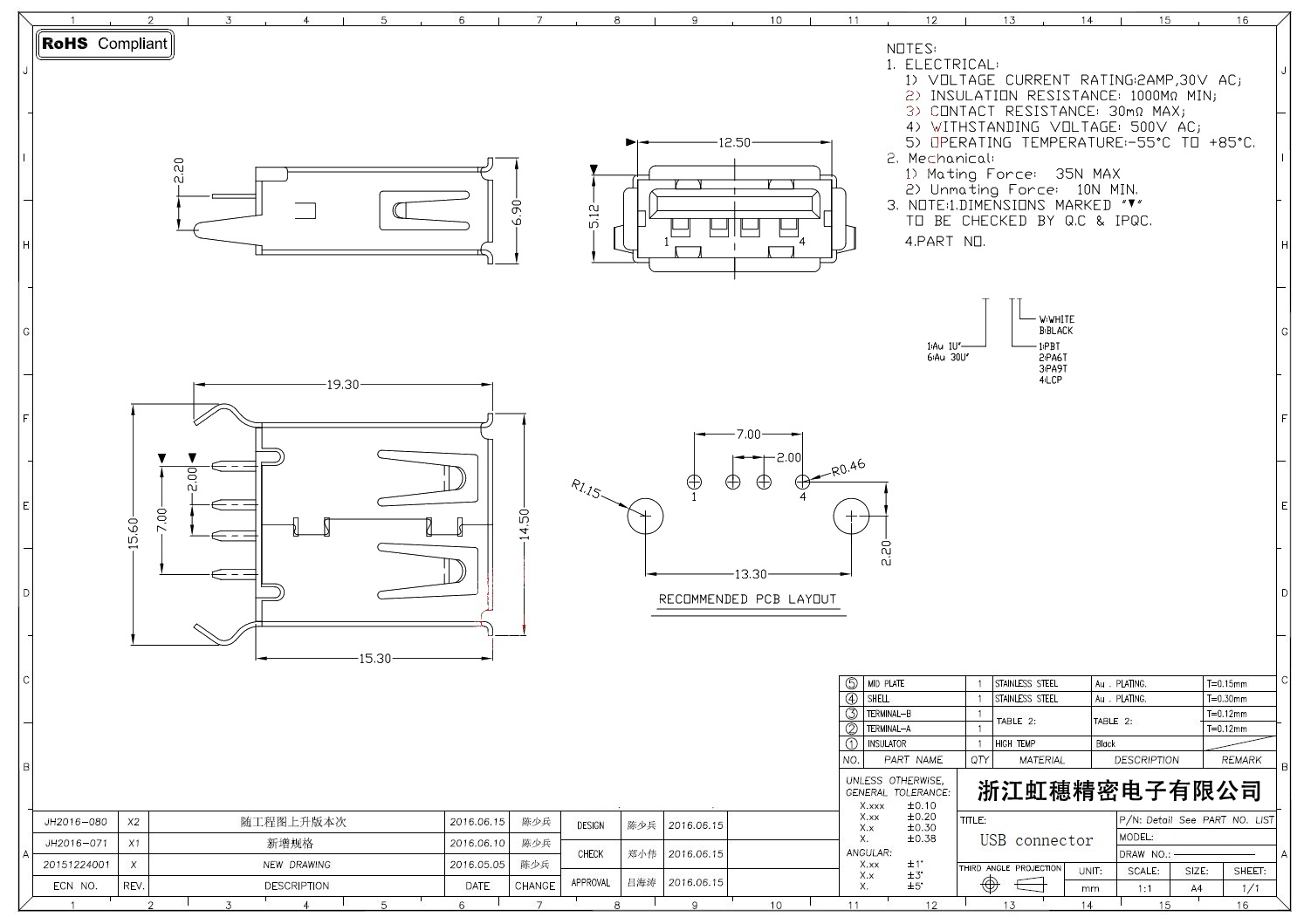 2.0USB插座技術參數: