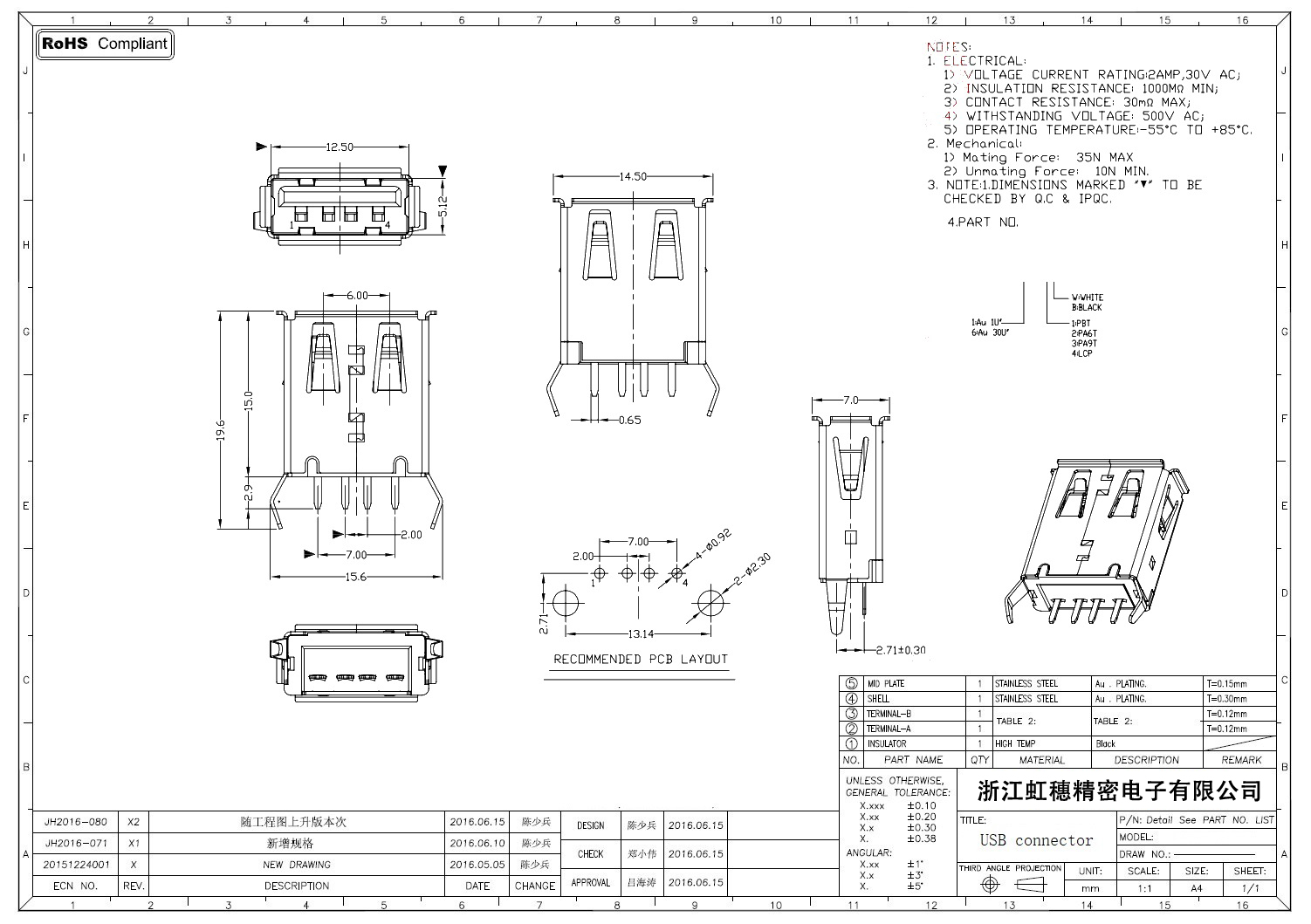 2.0USB插座技術參數:
