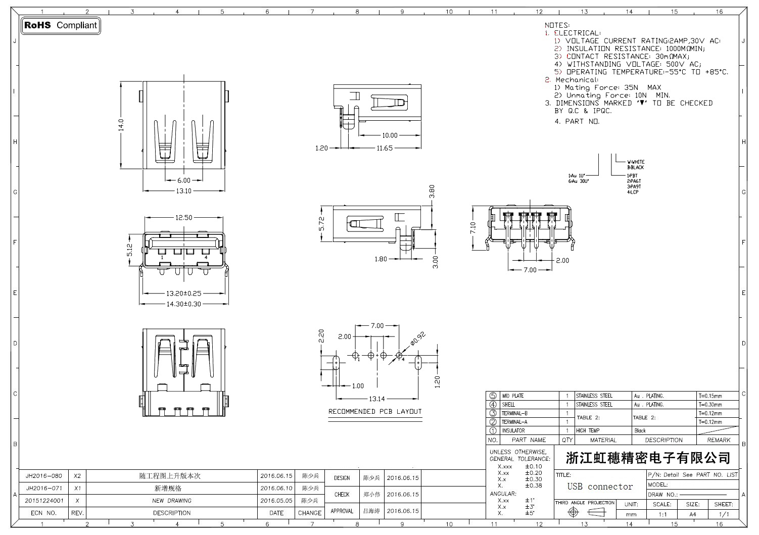 2.0USB插座技術參數: