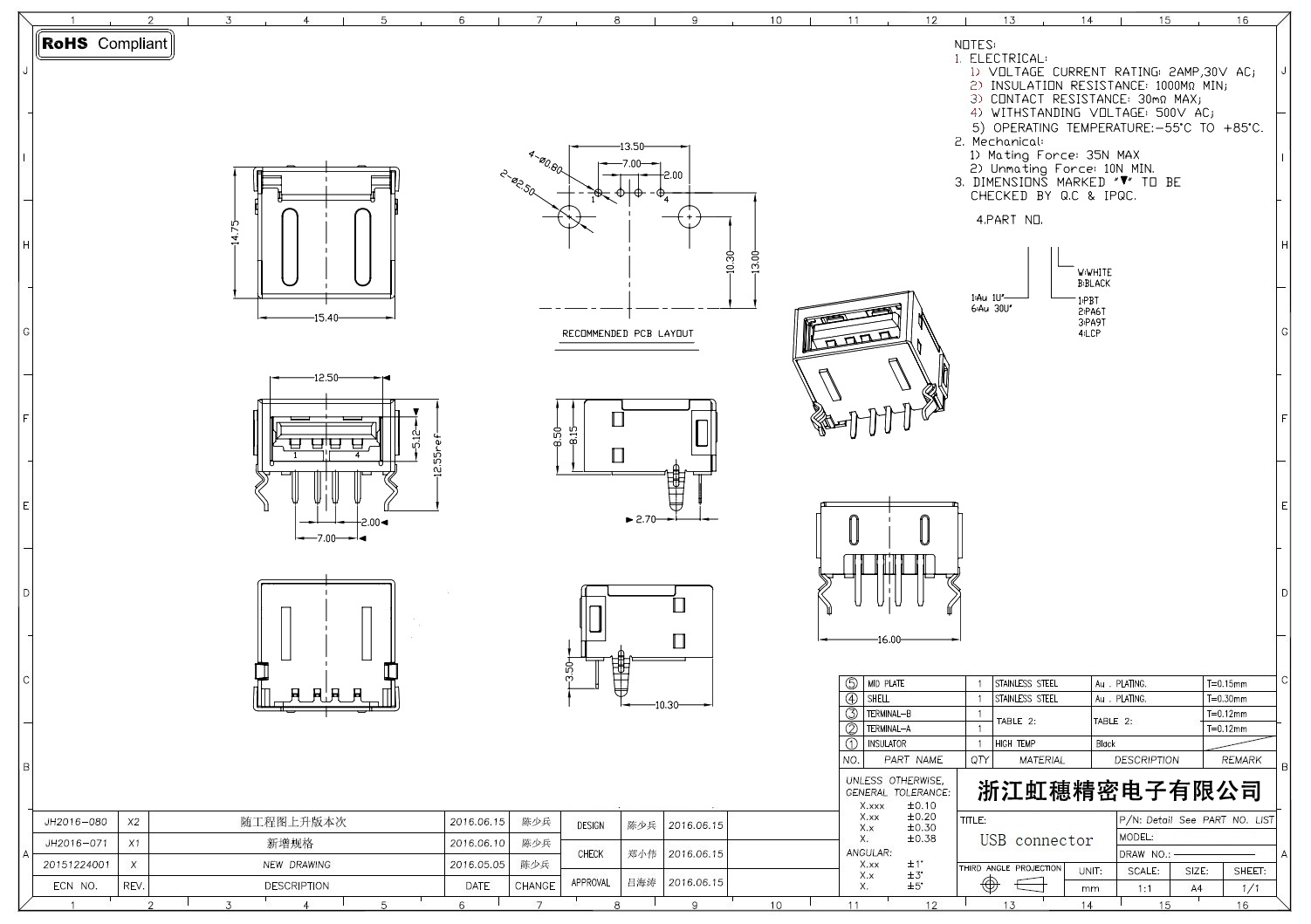 2.0USB插座技術參數: