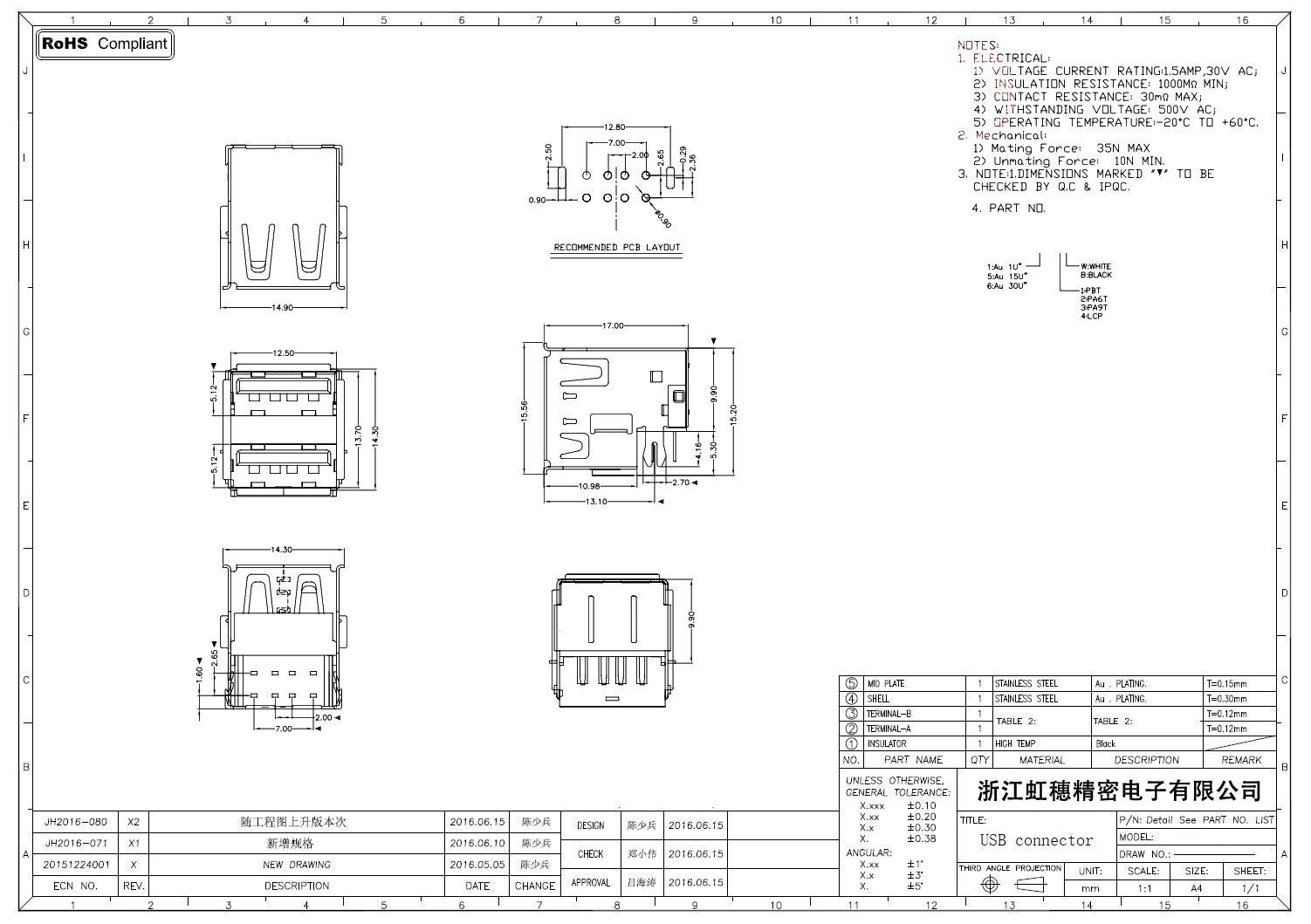 2.0USB插座技術參數: