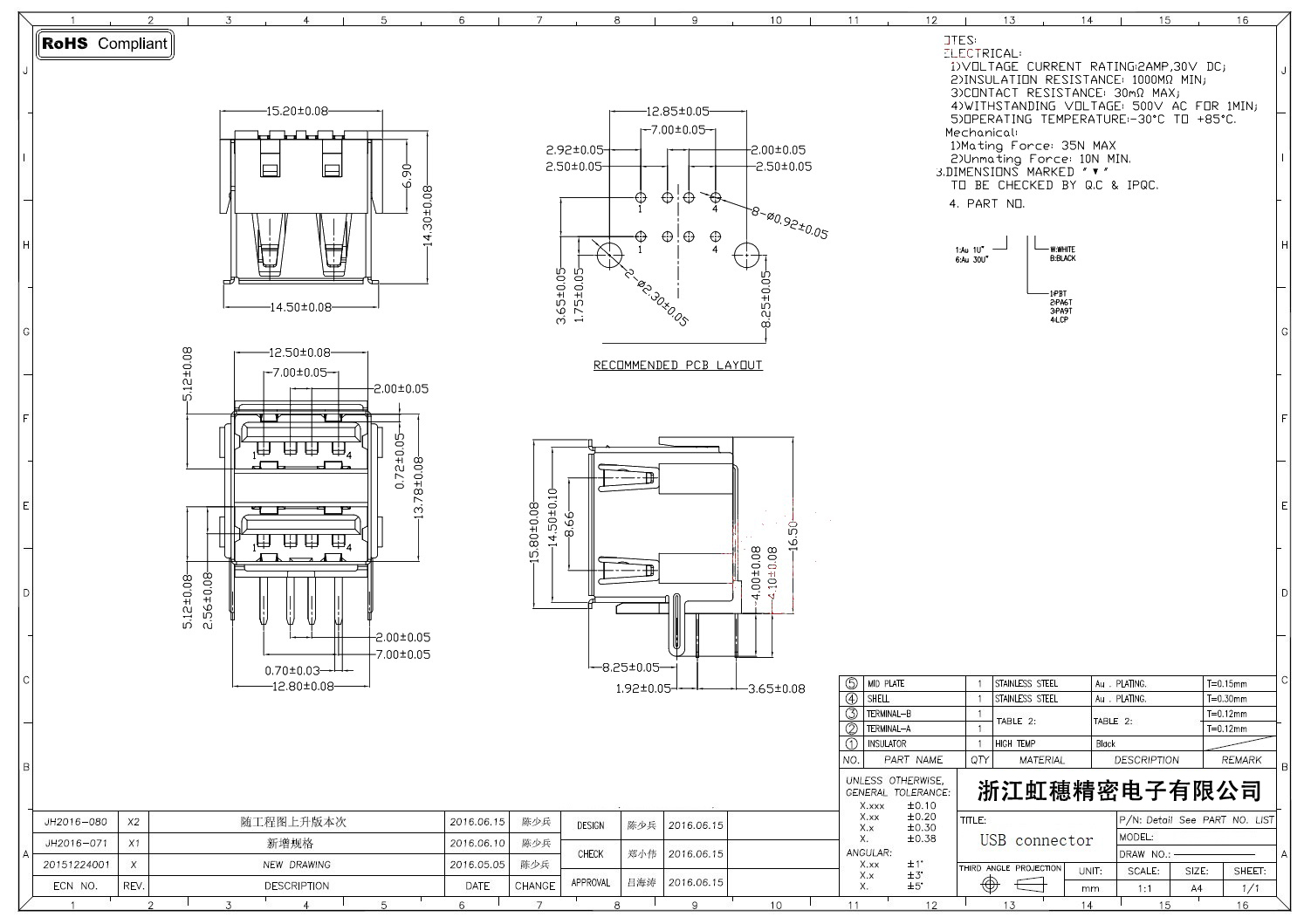 2.0USB插座技術參數: