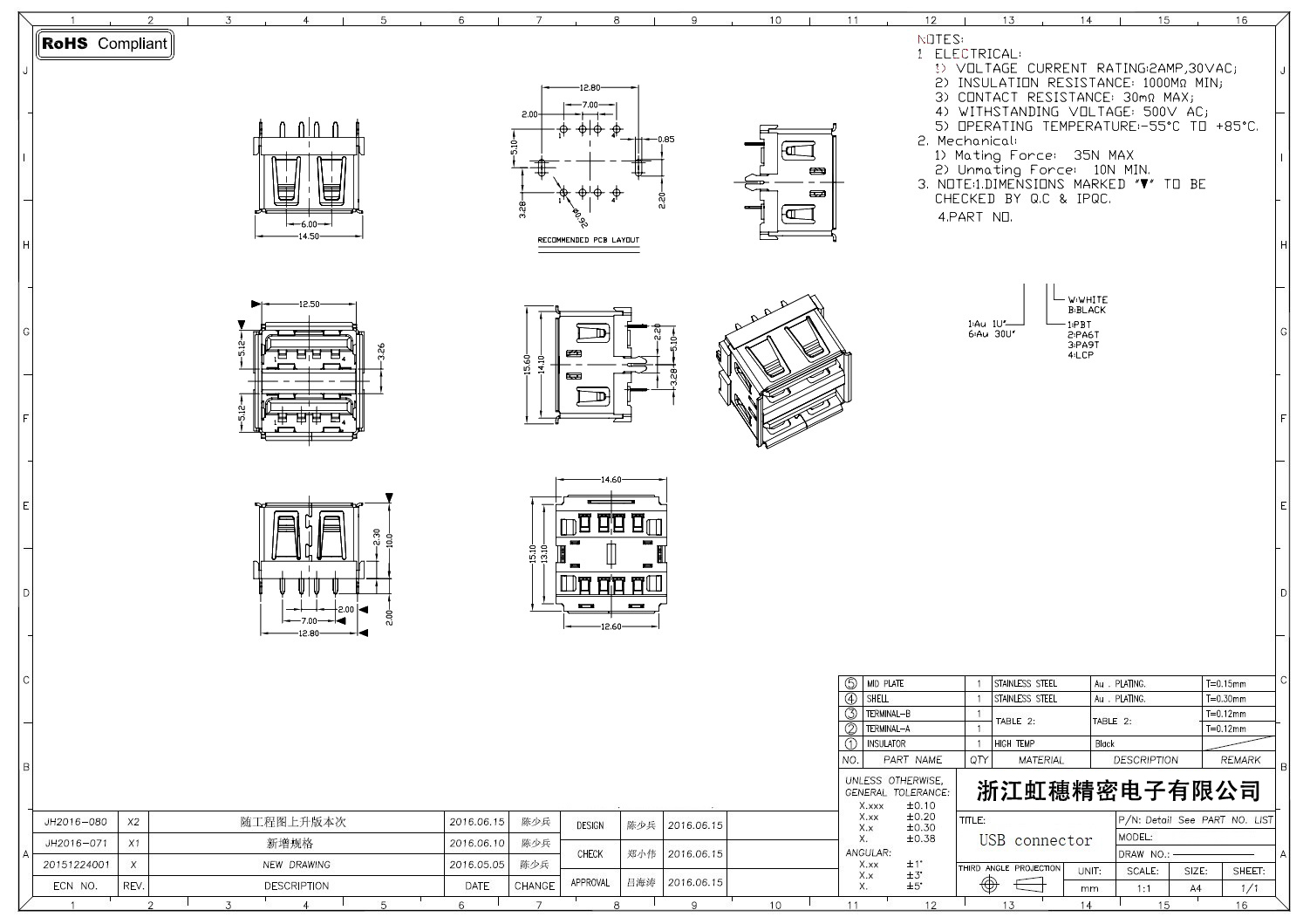 2.0USB插座技術參數: