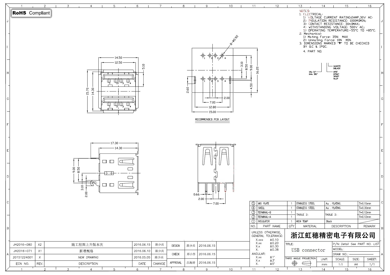 2.0USB插座技術參數: