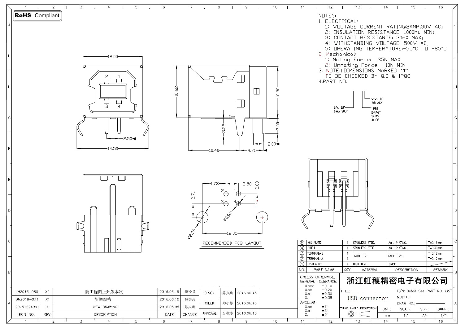 2.0USB插座技術參數:
