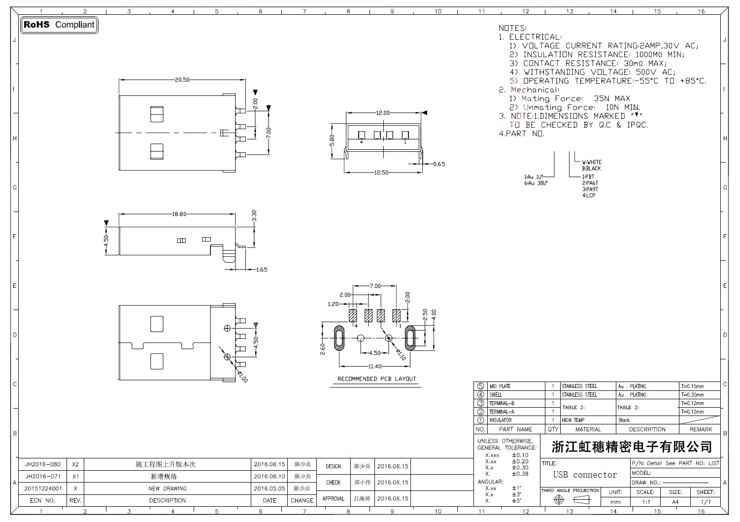 2.0USB插座技術參數: