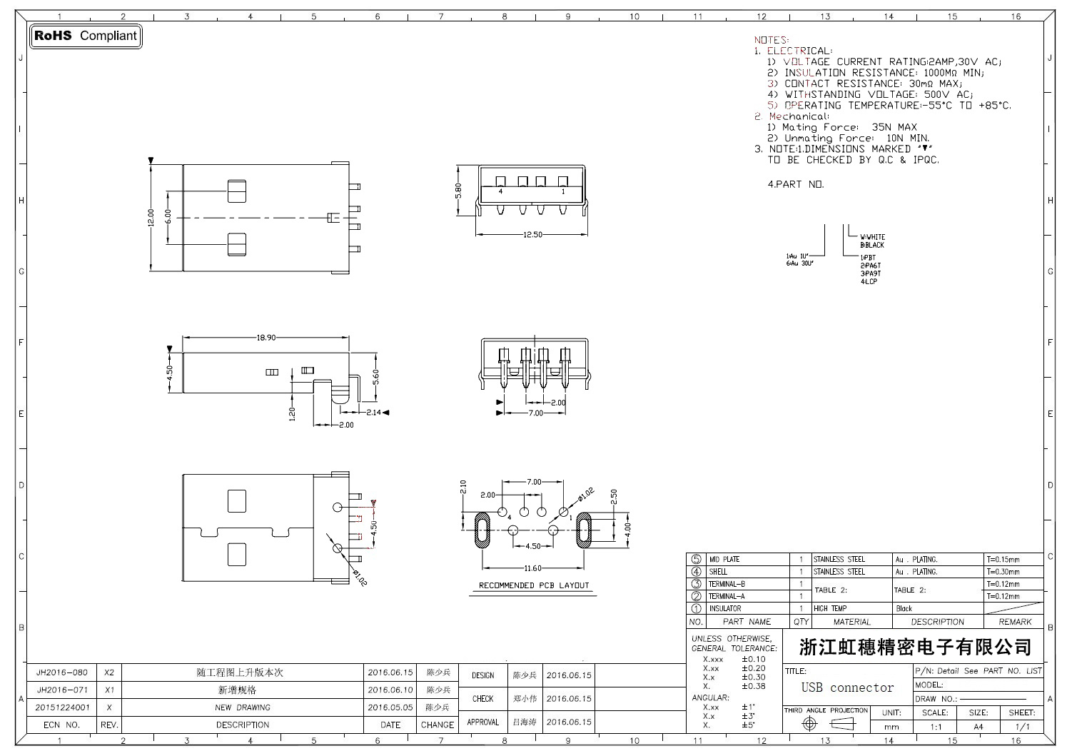 2.0USB插座技術參數: