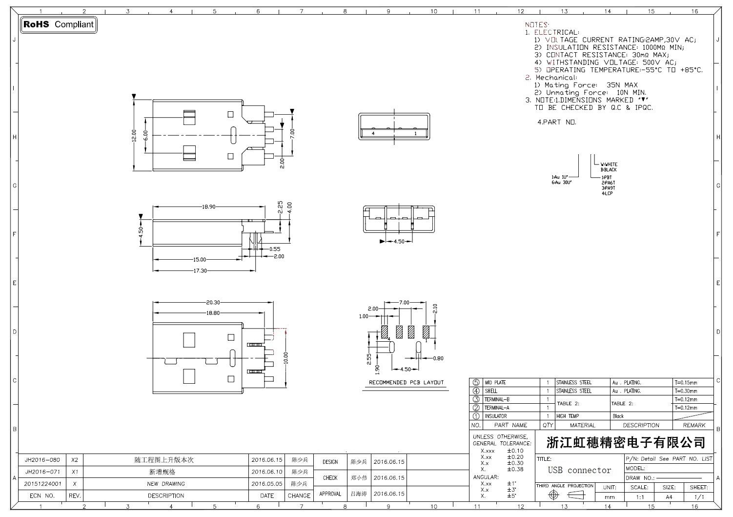 2.0USB插座技術(shù)參數(shù):