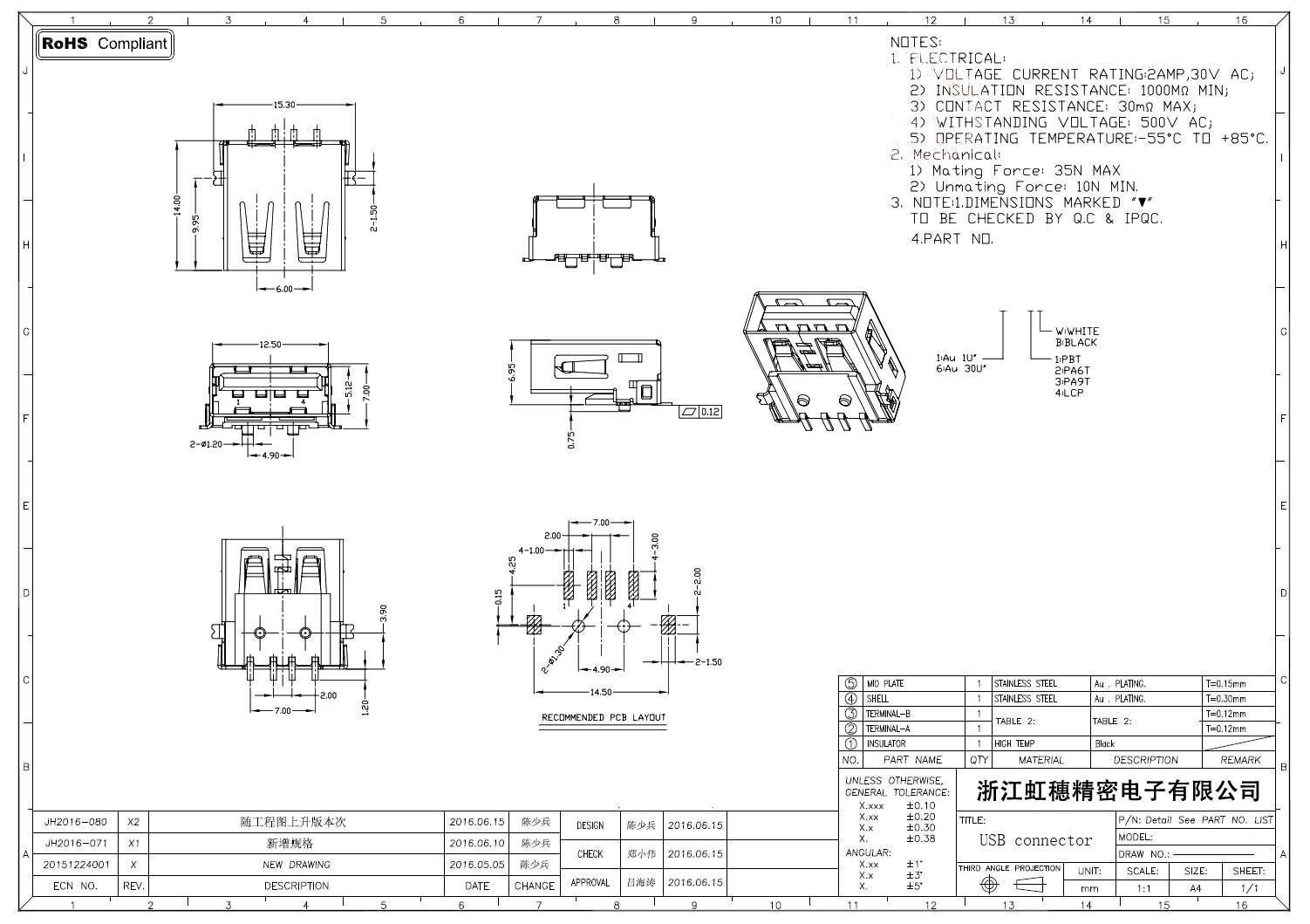 2.0USB插座技術參數: