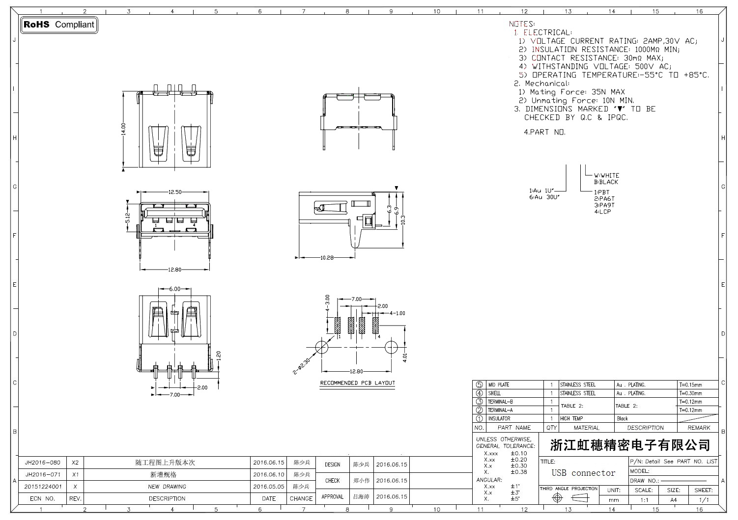 2.0USB插座技術參數: