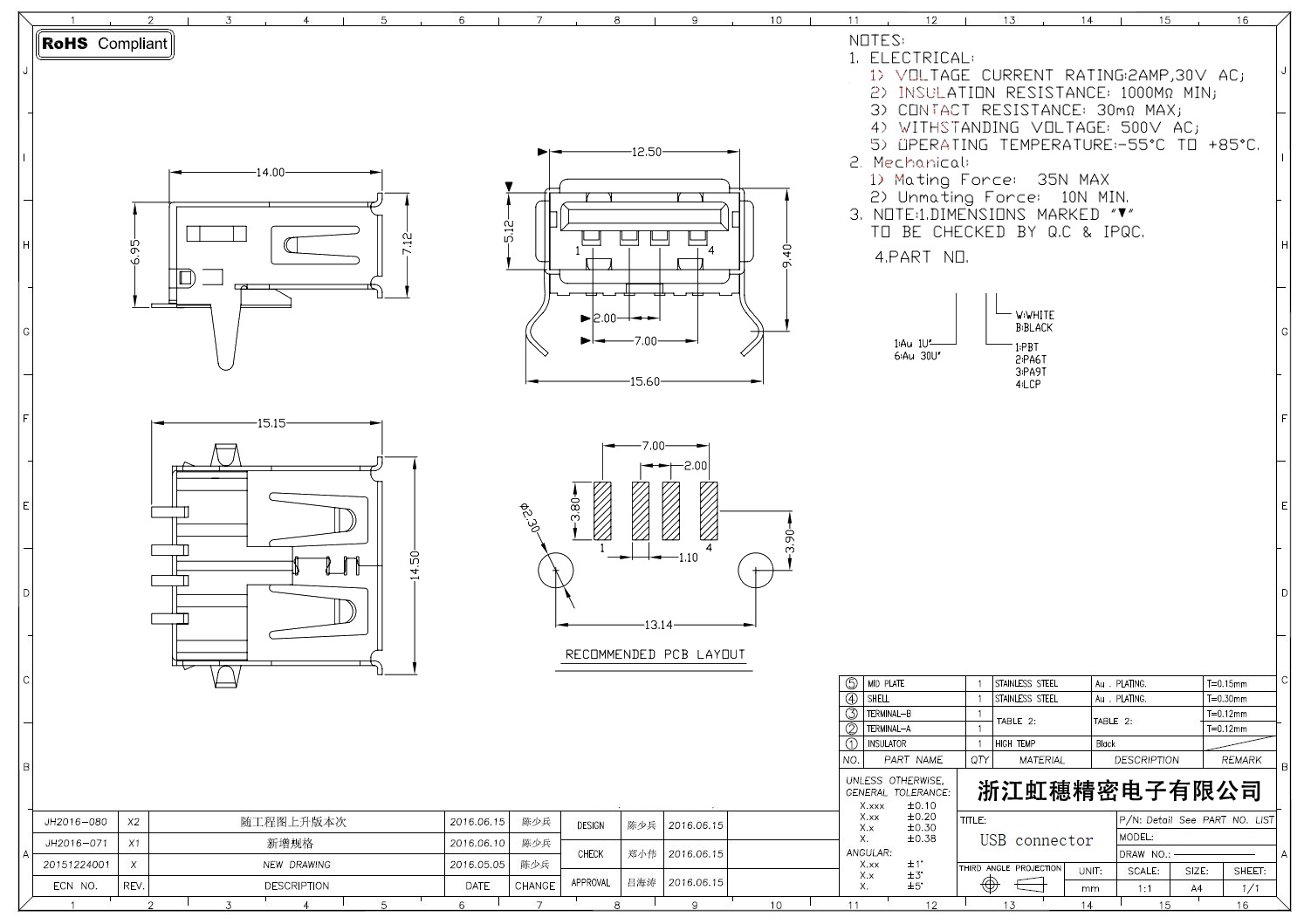 2.0USB插座技術參數: