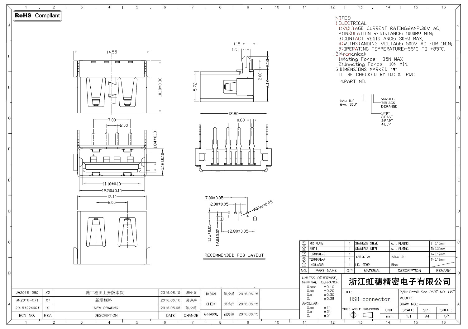 2.0USB插座技術參數: