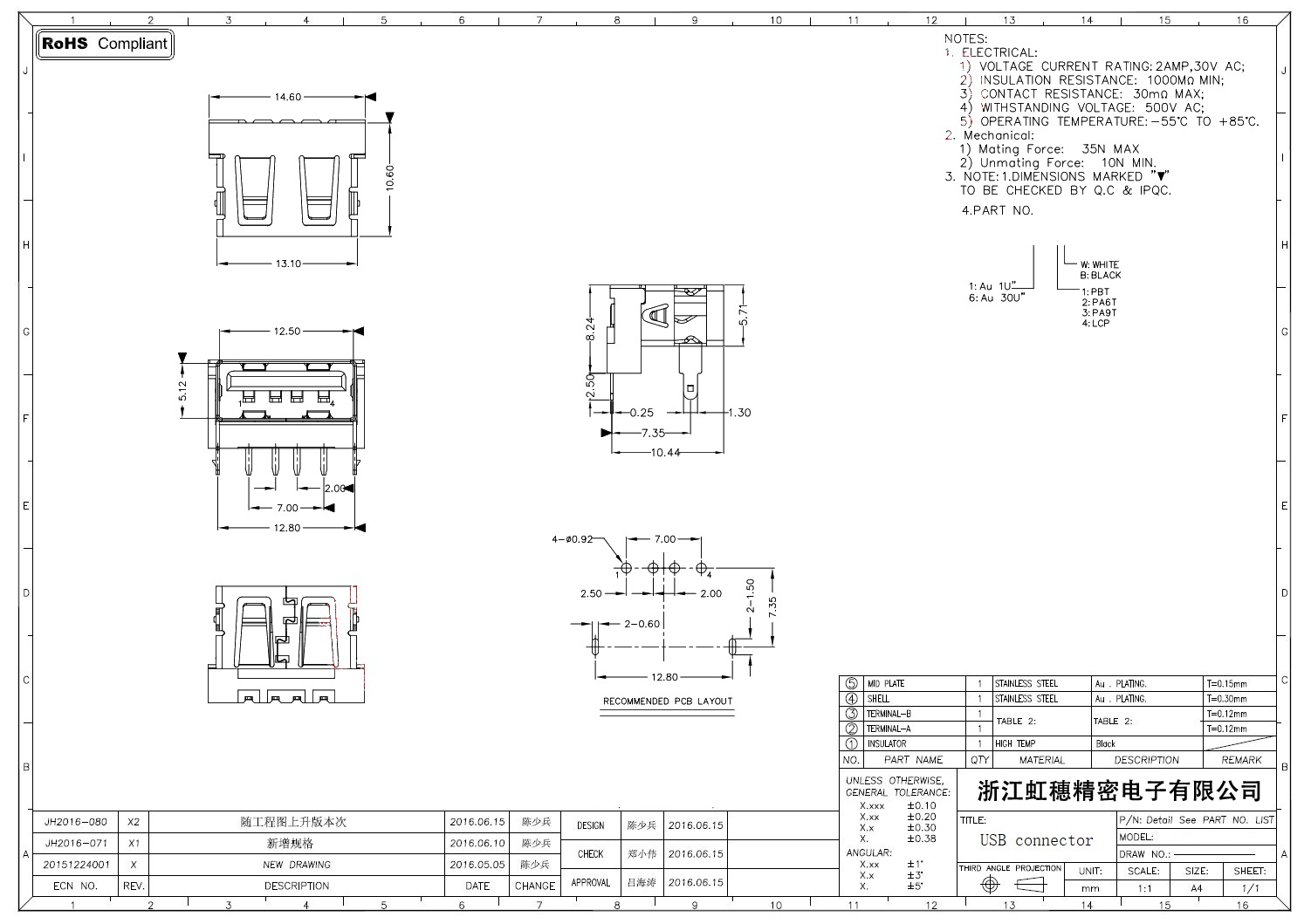 2.0USB插座技術參數: