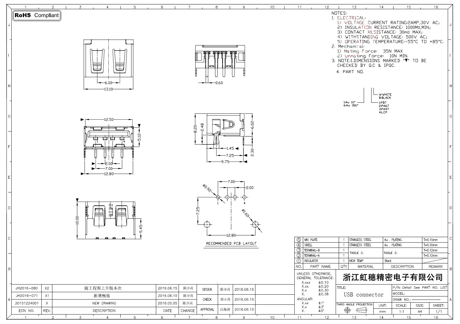 2.0USB插座技術參數: