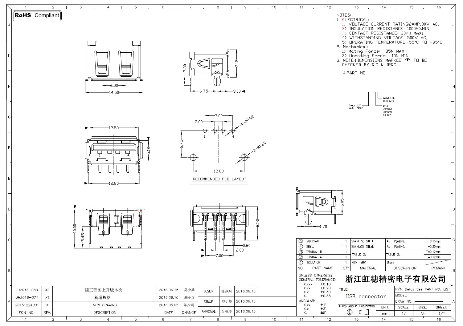 2.0USB插座技術參數: