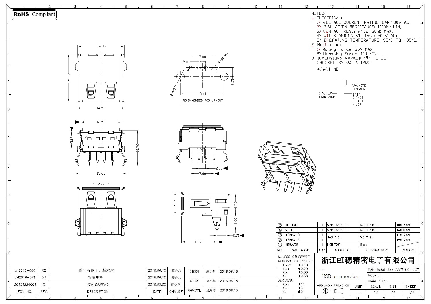 2.0USB插座技術參數: