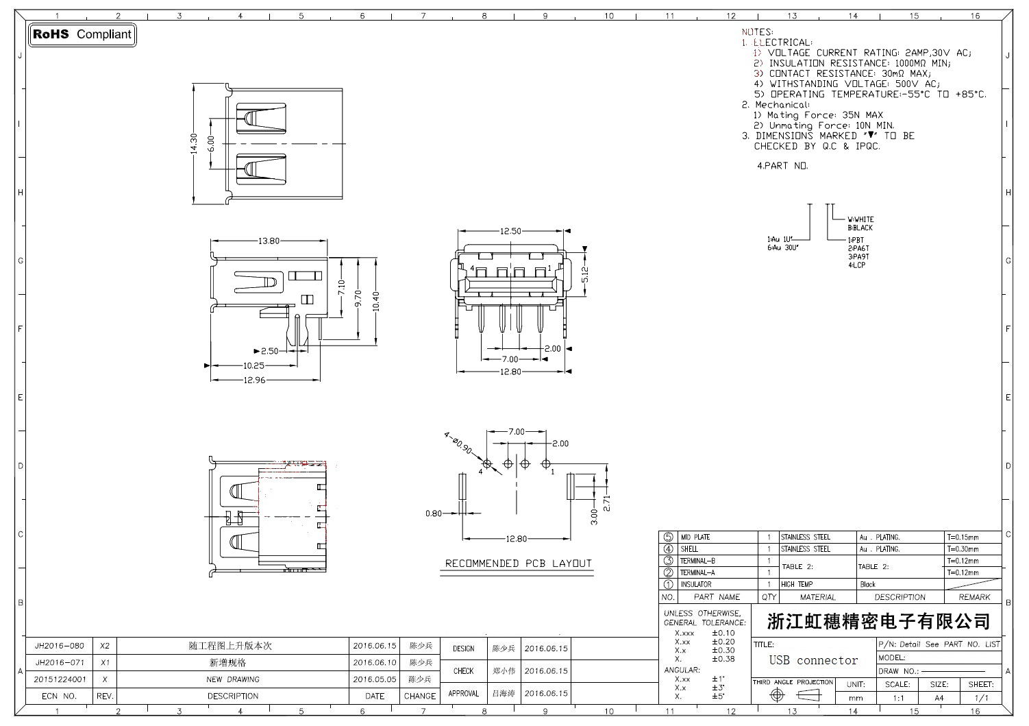 2.0USB插座技術參數: